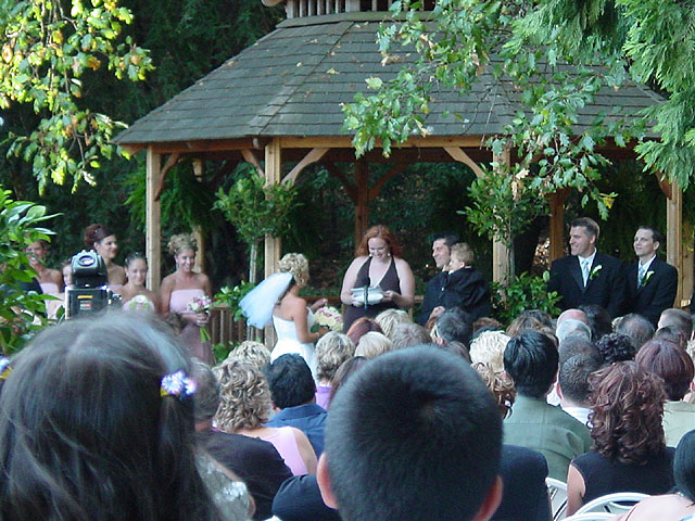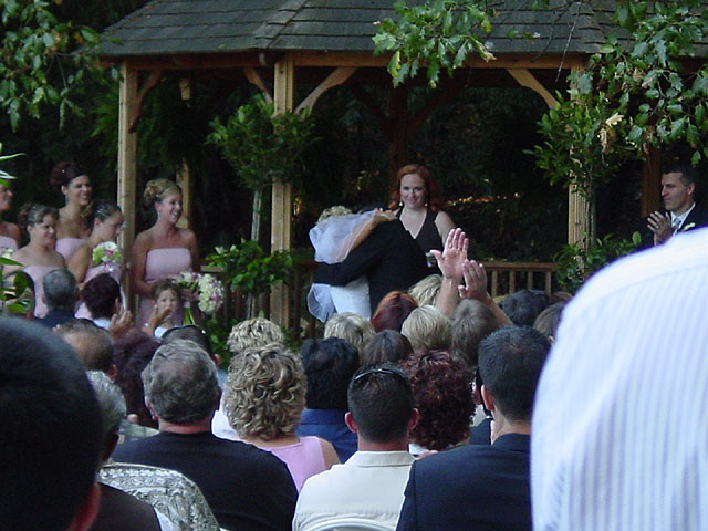 Getting ready for the big entrance. Almost time... Marie ready to go! What a dress! A beautiful outdoor ceremony. The reading. Dan gives his vows. Marie laughs at Dan fumbling his words. Marie gives Dan his ring. The kiss. They did it! Dan