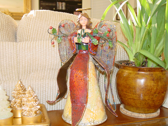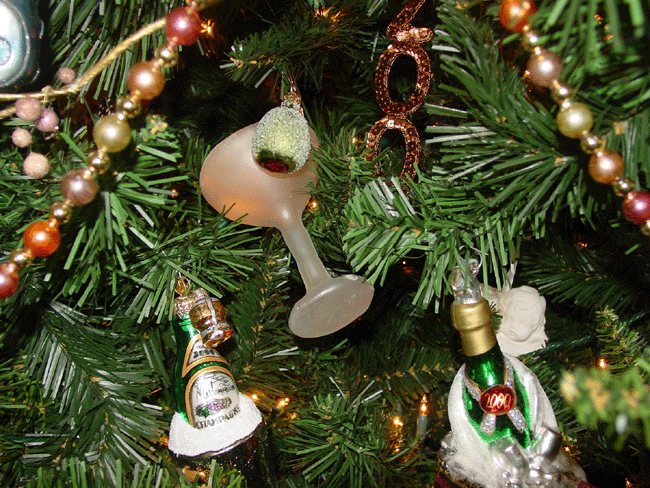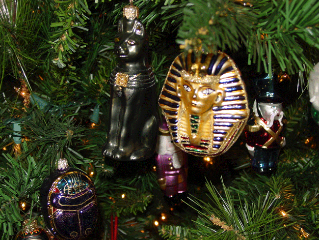 Egyptian ornaments. Gingerbread couple. Carousel animals. Martini and more... Glass maple leaf, butterfly, etc. Radko moon and sun. Snow dusted wreath. Partridge in a pear tree candelabra. Top of wine table. Collection of Christmas globes. Angel. Top of sofa table.. Dancing frogs. Stockings. Top of liquor cabinet.