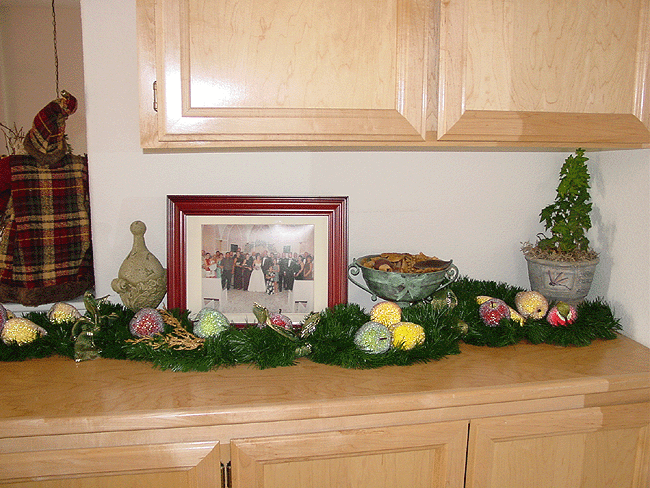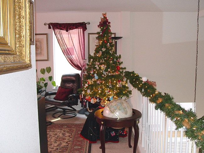 Christmas music box. Mirror in livingroom. Fruit tree Heidi made. Miniature tree Heidi made. Santa and deer upstairs. Hallway with garland and beaded fruit. Mini tree with little ornaments. Mini tree with train. Rudolph-topped tree in loft. Another view of tree in loft. Gingerbread house Heidi made! Another view.