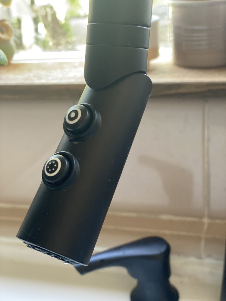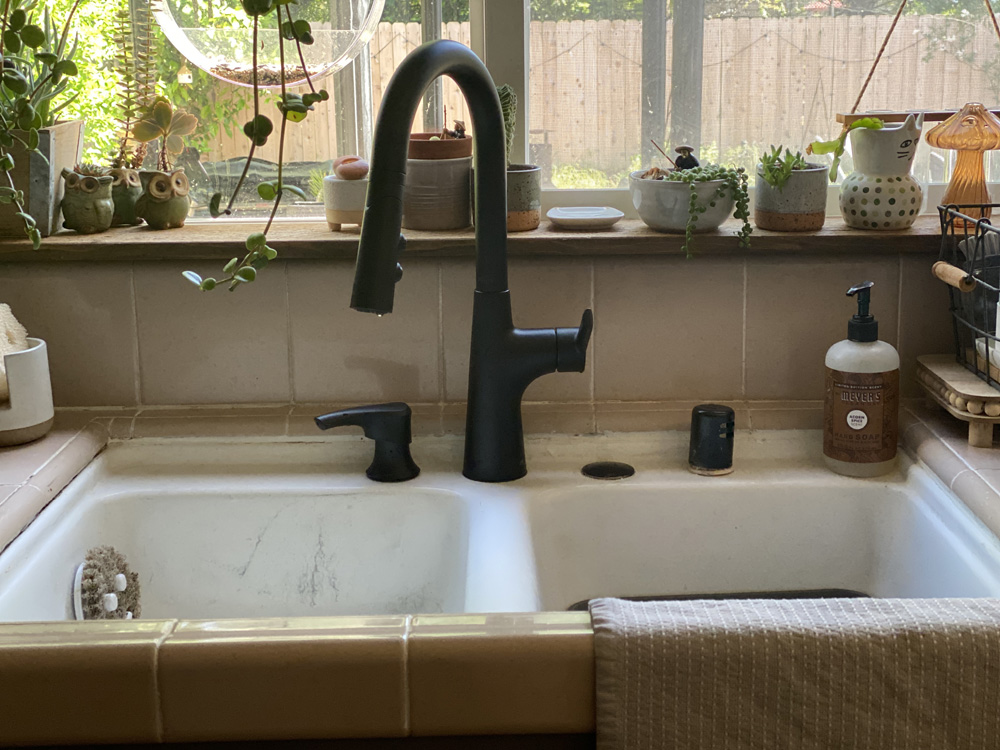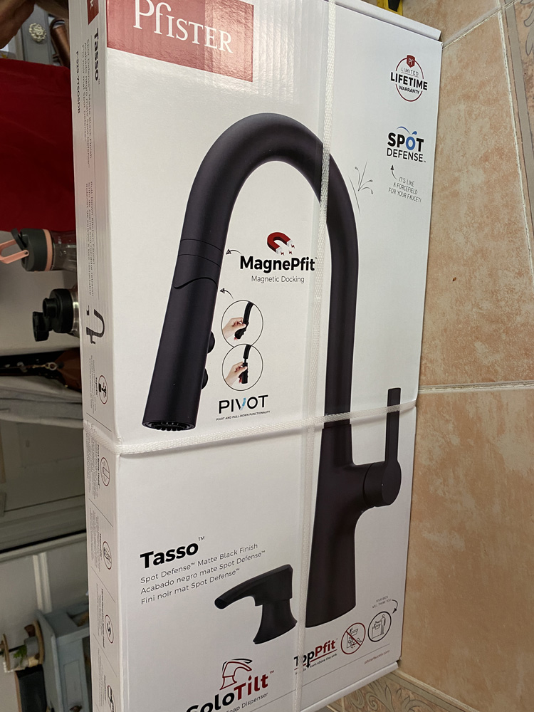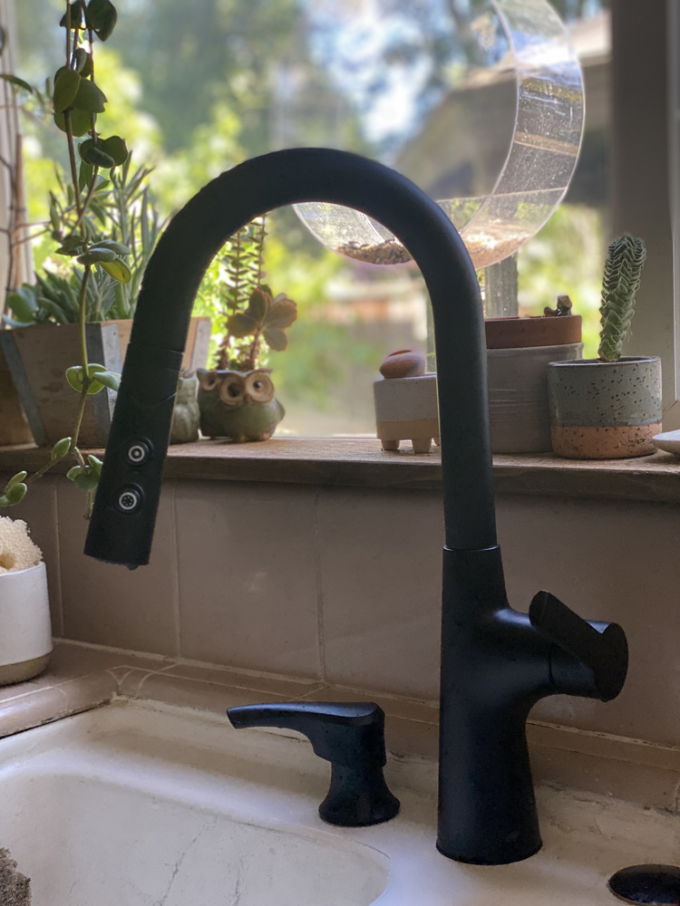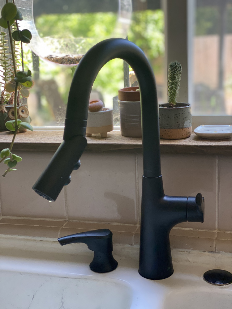 Our kitchen faucet was in desperate need of replacement. Found this beautiful Pfister Tasso faucet with a pivot head in a black finish and fell in love with it. Even though we still need to replace our sink and counters, the faucet looks great!