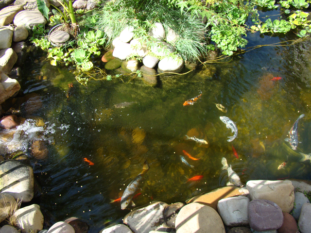 Water plants. Koi Koi Koi Koi Koi Koi Koi & catfish Koi turtle Turtle party. Bullfrog hiding in the grass.