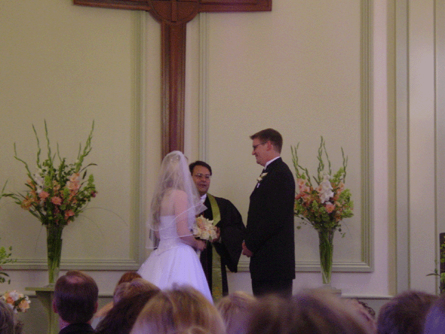 Ceremony Exchanging vows. Doug gives Jessica the ring. Jessica gives Doug his ring. The kiss. The married couple! Mr. and Mrs. Schiller! Outside after the wedding. Heidi outside the church. Our table. Our table. Our table.