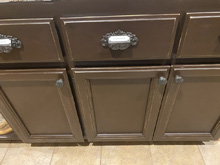 Dave demolished the kitchen tile in his underwear...lol. We sprayed the doors and rolled on the frame, added new hardware, and Heidi faux painted the plywood top for now until a new counter is purchased!